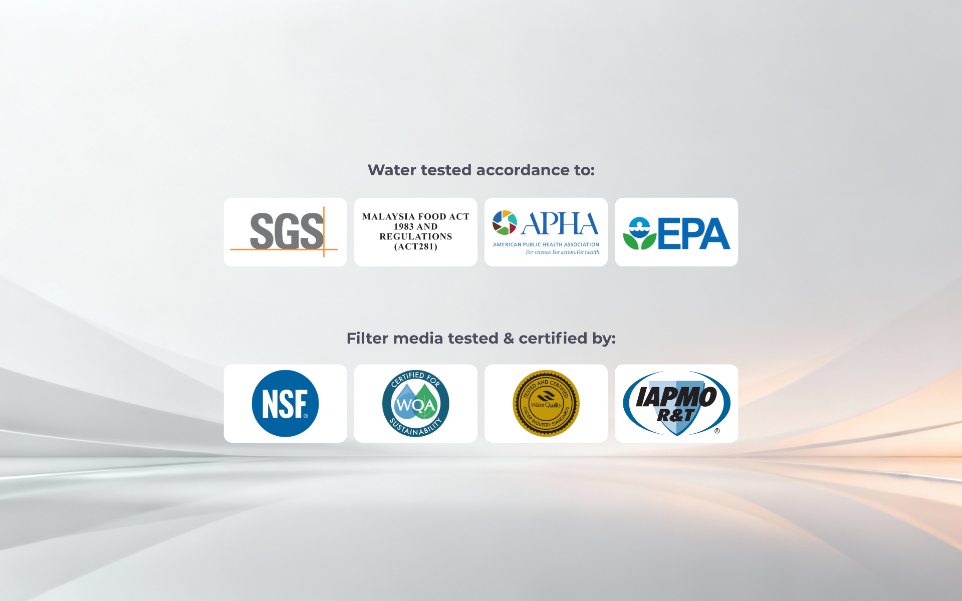 Tested and certified to meet SGS, EPA, APHA, and Malaysia Food Act 1983 (ACT281) standards.